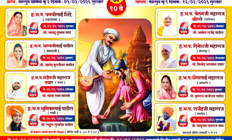 तसेच ११ मार्च रोजी पालखी सोहळा तर १२ मार्च रोजी काल्याचे कीर्तन व महाप्रसाद असा कार्यक्रम होणार आहे. या धार्मिक सोहळ्यासाठी परिसरातील वारकरी, भाविक आणि ग्रामस्थांनी मोठ्या संख्येने उपस्थित राहून कार्यक्रमाची शोभा वाढवावी, असे आवाहन आयोजकांकडून करण्यात आले आहे.
