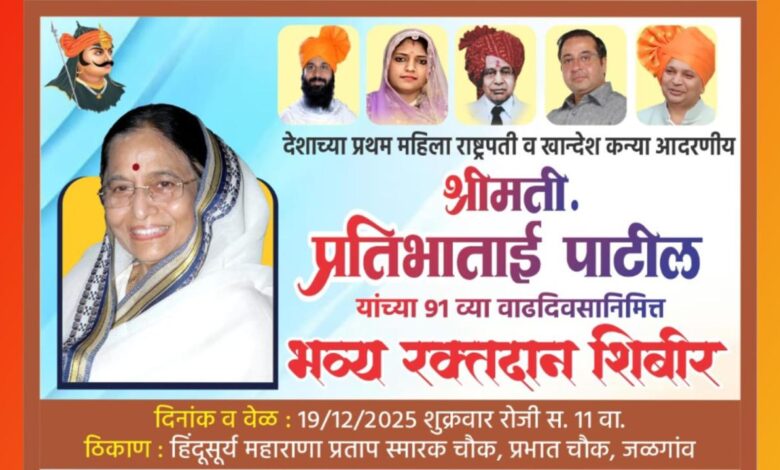 हॅलो जनता न्यूज, जळगाव : देशाच्या प्रथम महिला राष्ट्रपती व खान्देशच्या कन्या आदरणीय श्रीमती प्रतिभाताई पाटील यांच्या ९१ व्या वाढदिवसानिमित्त तसेच श्री राष्ट्रीय राजपूत करणी सेनाचे राष्ट्रीय अध्यक्ष सुप्रिमो स्व. दादा सुखदेवसिंह गोगामेडी यांच्या द्वितीय पुण्यस्मरण दिनाचे औचित्य साधून भव्य रक्तदान शिबिराचे आयोजन करण्यात आले आहे.हे रक्तदान शिबिर शुक्रवार, दि. १९ डिसेंबर २०२५ रोजी सकाळी ११ वाजता हिंदूसूर्य महाराणा प्रताप स्मारक चौक, प्रभात चौक, जळगाव येथे आयोजित करण्यात आले आहे.